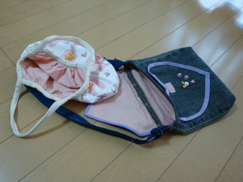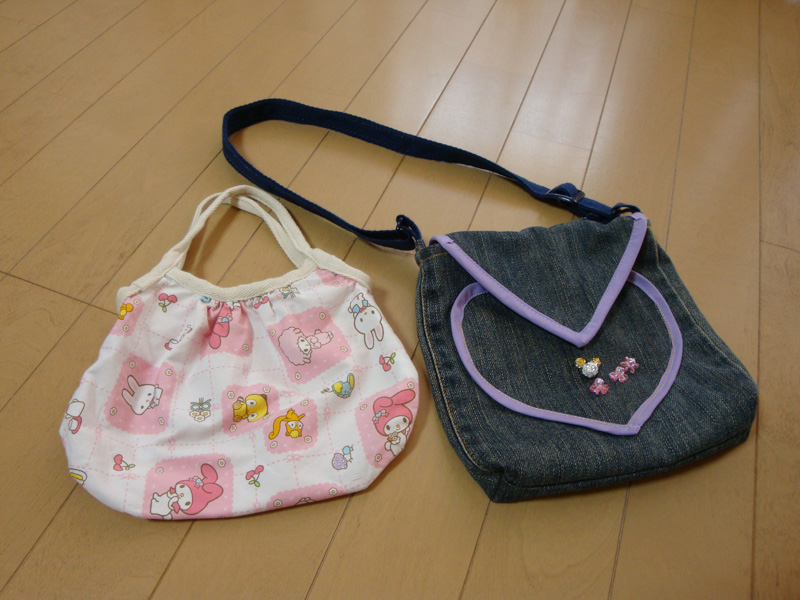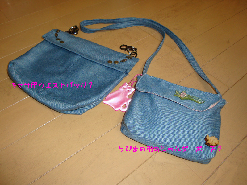 写真を撮ってなかった、ちびまめ用のショルダーとキャサ用に作ったベルト通しに引っ掛けるタイプのウエストバッグを撮ってみた