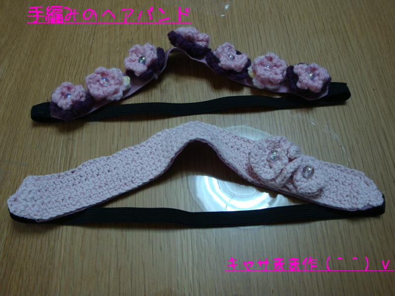 写真上は、6枚花びらの花と5枚花びらの花を編んで中心にビーズを付けて、自作のヘアバンドに縫い付けたもの